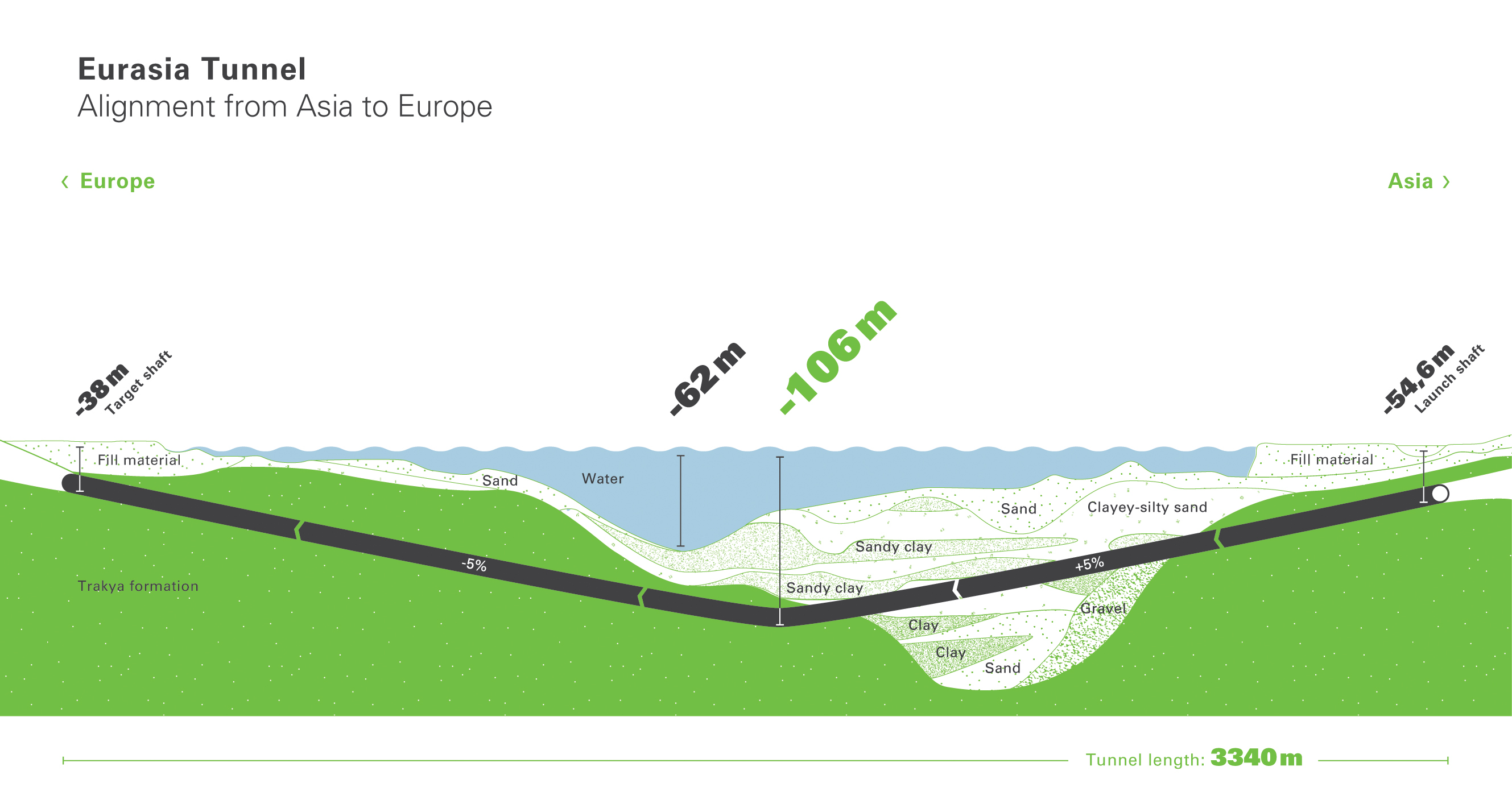 Meaning "throat" in the Turkish language, the great channel was carved through the local Trakya Formation, a complex of sandstones and mudstones, by sudden massive flows of water between the seas in geological times. In the glacial period it was partly filled with soft alluvial deposits but the water is still 62m deep where the tunnel crosses, with bedrock 40m below that. The tunnel goes through the permeable sediment and highly fractured rock, each saturated with the seawater above. "That meant using a TBM that could handle hard and soft ground and at high pressure" says Gert Wittneben, TBM construction manager for the YMSK joint venture building the tunnel. YMSK JV is a combination of Turkish contractor Yapı Merkezi Construction as leader and Korean firm SK Engineering & Construction as partner. "It had to be a slurry machine, a Mixshield type."