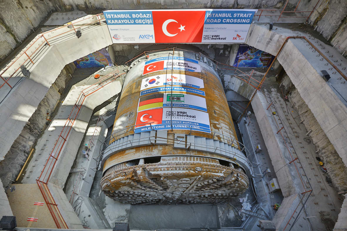 The Bosphorus road tunnel project which broke through this week in Turkey's great city of Istanbul, is a major achievement on one of the world's biggest and most challenging tunnel drives. At 13.66m diameter and 11 bar of water pressure in fractured rock and soft ground the 3.34km long bore is unprecedented. It has needed skillful engineering on site and extended TBM technology to do it.