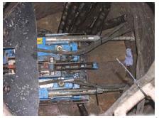 The Grundoburst was placed on top of a height-adjustable working platform, 1 m above the bottom of the manhole and was secured against the manhole walls. In the starting pit, a guide cone was connected to the rod string (Fig. 17). The first new pipe section was then attached to the guide cone and safely tensioned using the Burstfix (Fig. 18). The Burstfix kept the short pipe sections safely together during the pulling-in operation. The rollers in the front of the guide cone aligned it centrally in the host pipe and assisted to restore the circular profile of the host pipe. The new pipe could then follow in a relatively friction-free environment.