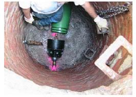 Manhole bursting rigs, already known from static pipe bursting, operate with pulling forces between 200 and 400 KN (45,000 – 90,000 lbs), depending on pipe size and also use QuickLock rods. The rig can be used for bursting as well as calibre pipe bursting and the Tight-In-Pipe method.