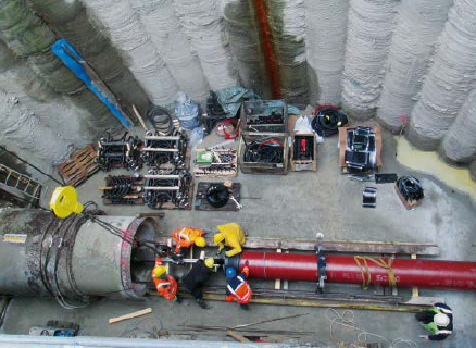 Assembling the ductile iron pipes in the launch shaft. [Source: Lars Kolbig and Lutz Rau]