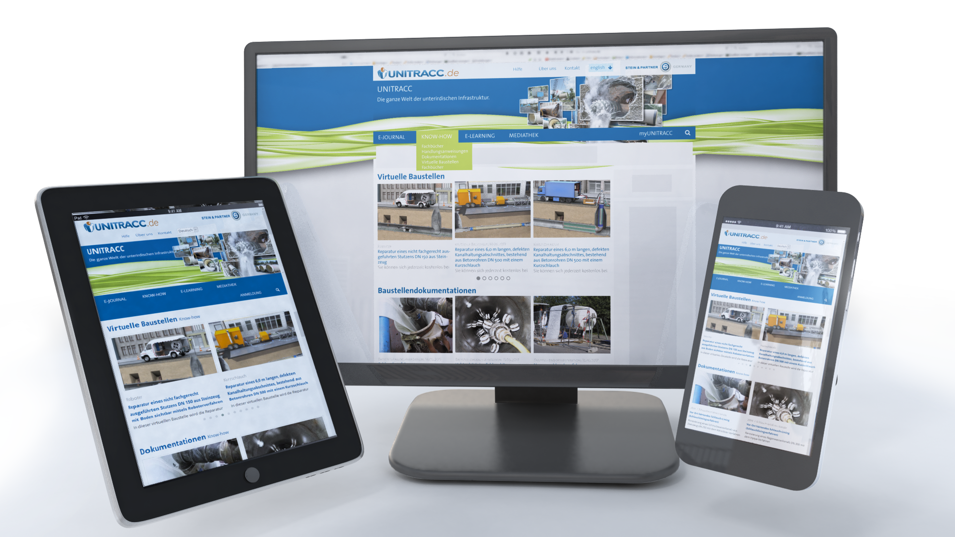 In the past, our web designers started developing desktop optimized pages. Today, the mobile version attracts much more attention within the development process. However, many topics require a certain screen resolution to maximise the user experience. Virtual construction sites, technical books with advanced multimedia elements, and the extensive e-learning modules require a certain screen size to allow a comfortable way of reading and learning. Therefore tablets are the most important mobile device for UNITRACC. In Addition to the technical innovations, a decisive change is in the enhanced usability. The navigation system is adjusted to the different topics by means of meaningful graphics and images. Several demos and examples at UNITRACC are accessible at any time and without registration.