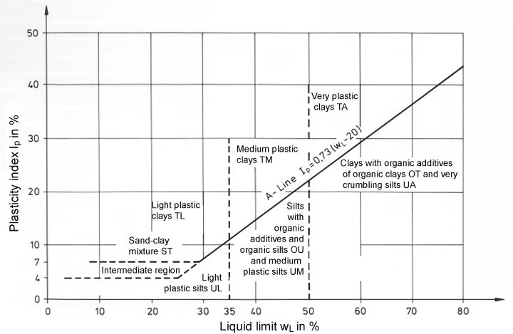 Plasticity diagram according to Casagrande with soil groups to DIN 18196 [DIN18196:1988] [DIN18196:2004] |