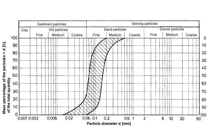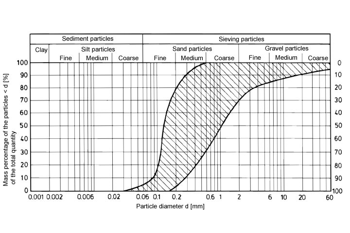 In any case of specific application, the existing site-specific grain size distribution of the soil should always be determined, using the already known results from other sites in the vicinity could have distortive effects. This is illustrated by the following grain distribution curves of various soil samples collected in the German city of Hamburg. They clearly illustrate the variety of grain sizes and soil uniformity of soil samples collected from a relatively small geographical area.