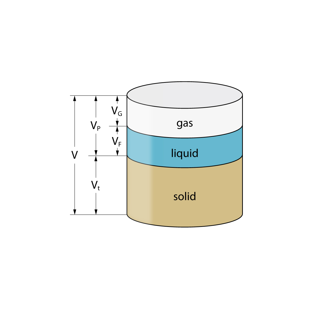 The soil model [Image: visaplan GmbH] Key: V = Total volume Vt = Volume of the solid grains VP = Volume of the voids VG = Volume of the gases VF = Volume of the liquids |