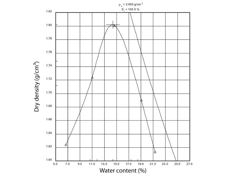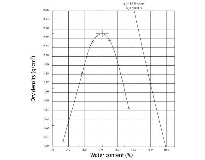 The soil sample is placed into a cylinder and is then compacted through tamping with a weight at different levels of water content. The drop height, weight and number of blows are the defining parameters. The maximum density is achieved at a particular water content, and at a specified compacting energy.