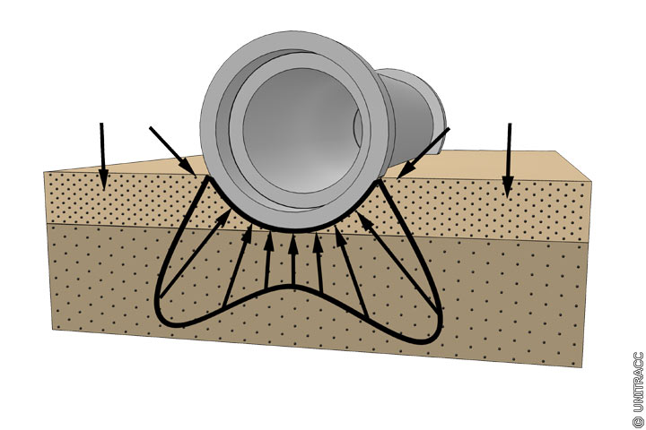 Lastkonzentration durch ungünstiges Steifigkeitsverhältnis zwischen Grabensohle und Bettungsschicht [Quelle: visaplan GmbH]