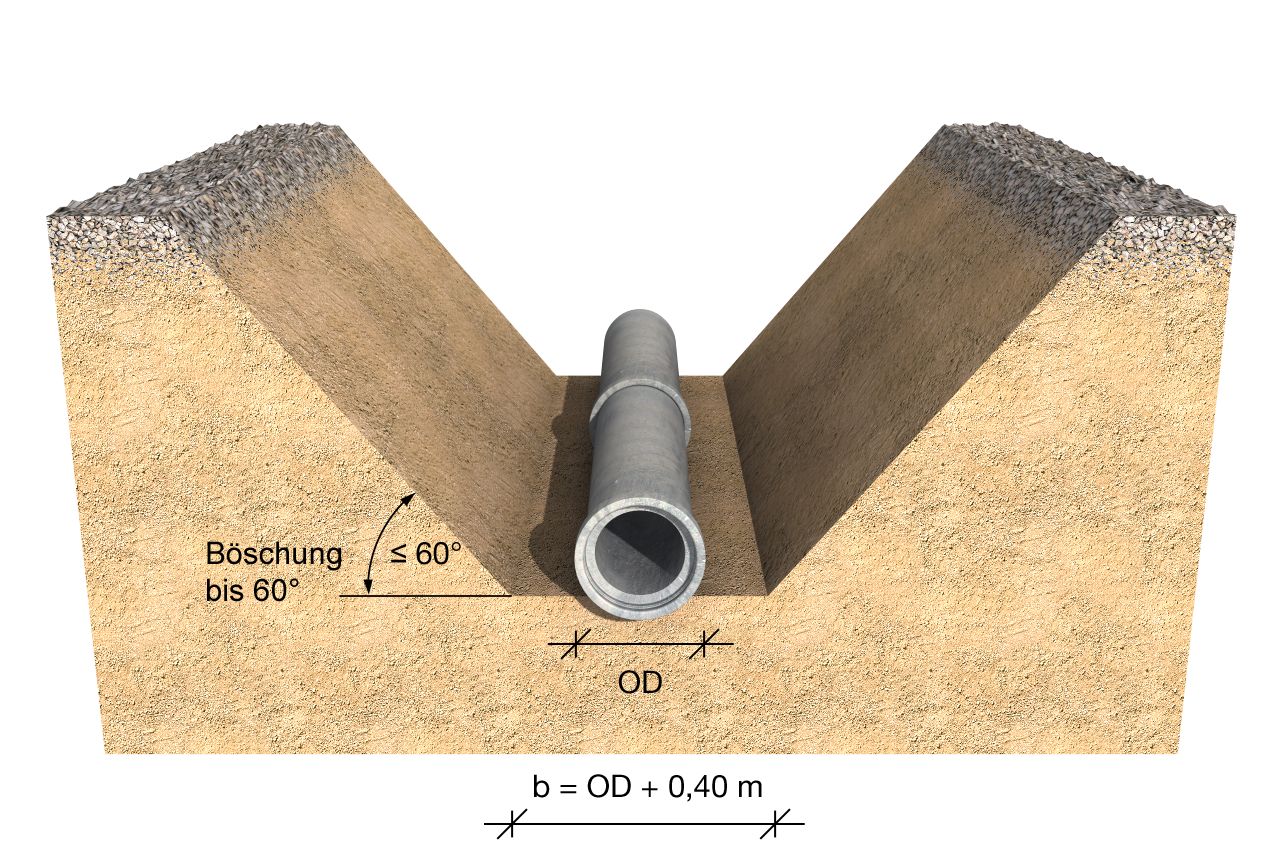 "Bei Rohren ≥ DN 600 in verbauten oder unverbauten Gräben, bei denen maschinelle Verdichtung der Bettung und der Seitenverfüllung erforderlich ist, sollte der Arbeitsraum x/2 mindestens 0,5 m betragen. In diesem Fall sollte die Mindestgrabenbreite ODh + 1,00 betragen." [DINEN1610:2015]