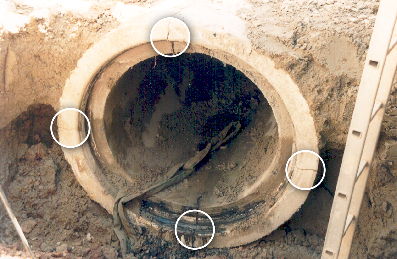 Die Nichteinhaltung der Mindestgrabenbreite führt zu einer unzureichenden Verdichtung der Bettung. Kreisrohre werden so überbeansprucht, und es bilden sich Risse in den Viertelspunkten. Risse in den Viertelspunkten bedeuten ein statisches Versagen, die maximale Belastung ist erreicht.