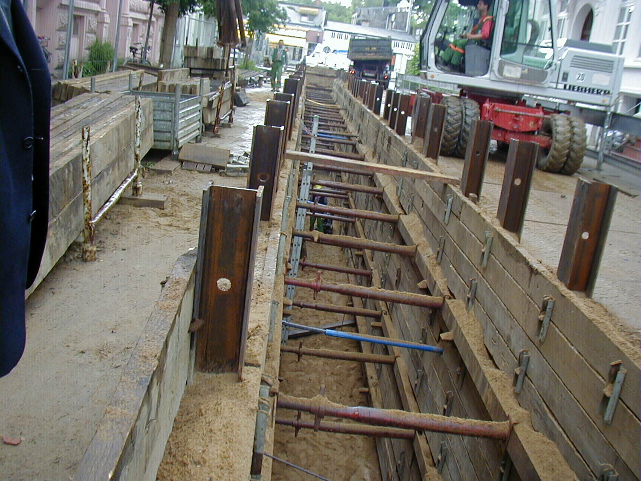 Beispiel für die Bettungsbedingung B1 - Verbau mit Träger und Bohlen [Bild: Güteschutz Kanalbau e.V.]
