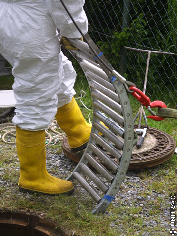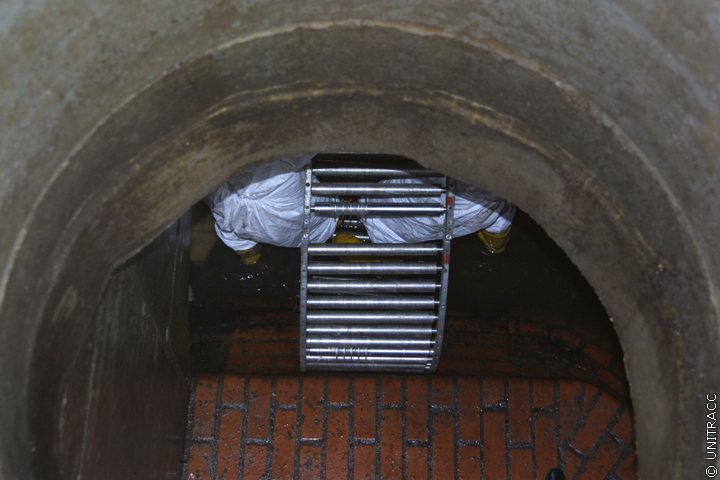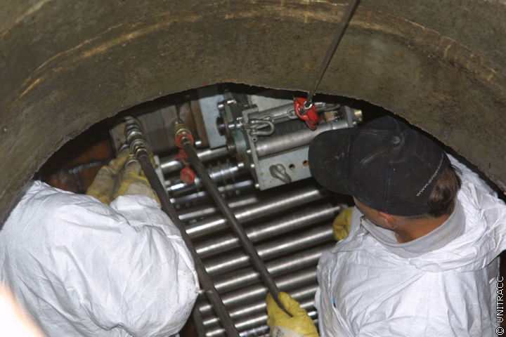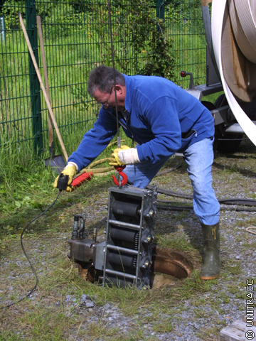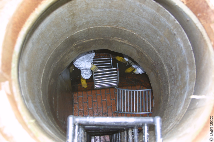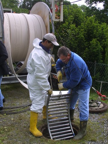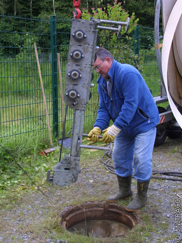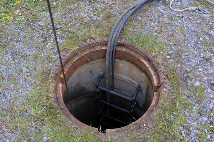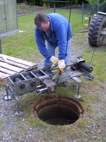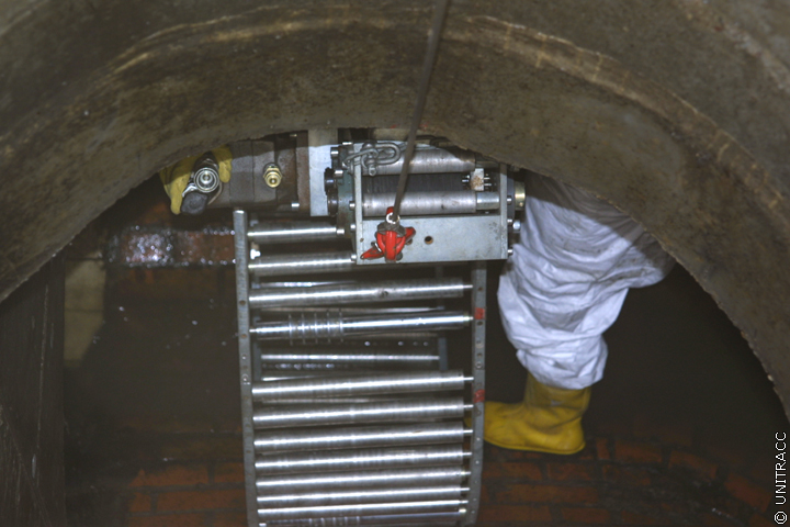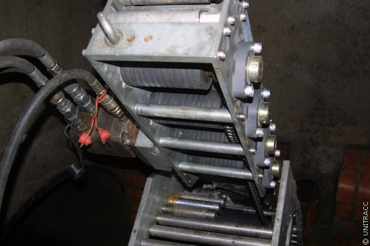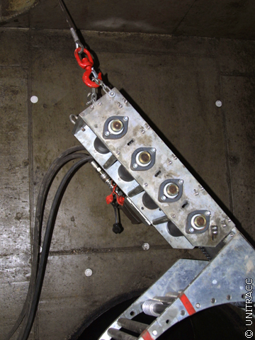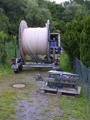 Mit dem Anschluss der Wickelmaschine an den Hydraulikantrieb im LKW werden die Einbauarbeiten der Wickelmaschine im Startschacht abgeschlossen. Damit die Anschlussschläuche beim späteren Wickelvorgang nicht stören, werden Sie durch die Steigeisen im Schacht gezogen.