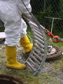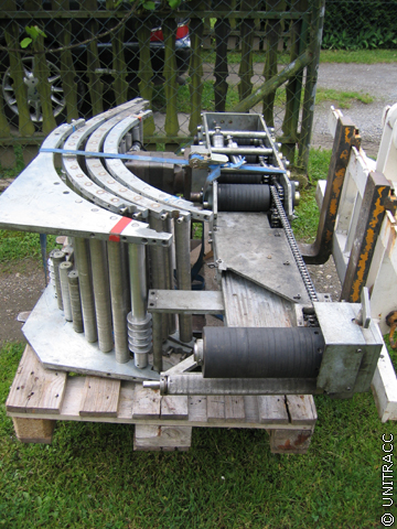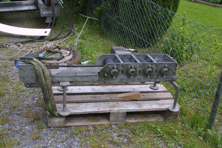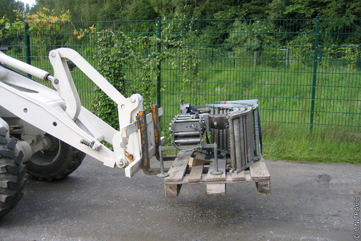 Zunächst wird die in Einzelteile zerlegte Wickelmaschine aus dem Lieferwagen mittels Radlader mit Staplervorsatz zum Startschacht transportiert. Sie besteht aus Maschinenantrieb und Wickelkorb. Nun wird der Staplervorsatz des Radladers gegen einen Auslegervorsatz ausgetauscht.
