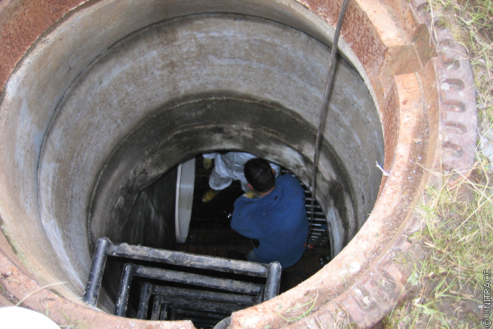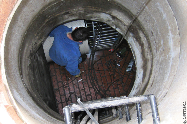 Stimmen die Längen überein, wird das Rohr im Startschacht mittels Winkelschleifer entsprechend abgelängt. Das auf dem Abwasser schwimmende Wickelrohr wird nun von zwei Personen aus dem Startschacht heraus in die zu sanierende Haltung eingeschoben, so dass es sowohl im Startschacht als auch im Zielschacht bündig mit der Schachtwandung abschließt.