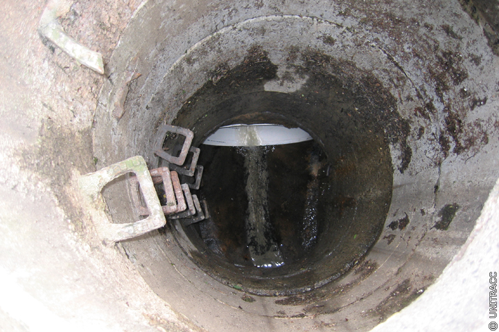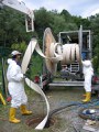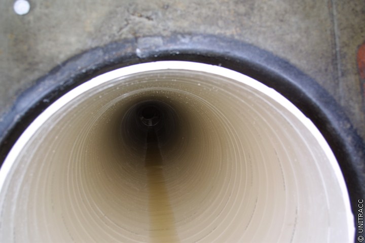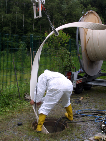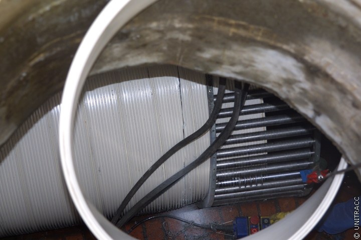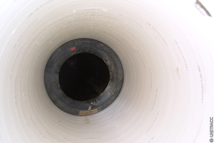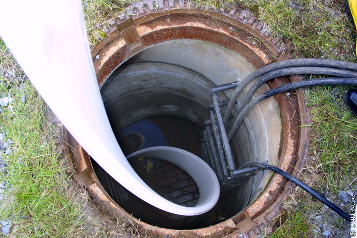 Nach dem das Wickelrohr in der zu sanierenden Haltung platziert wurde, wird der aufblasbare Dichtring am Rohranfang entfernt, so dass das Abwasser zum einen durch das eingebrachte Wickelrohr und zum anderen durch den Ringraum fließen kann.