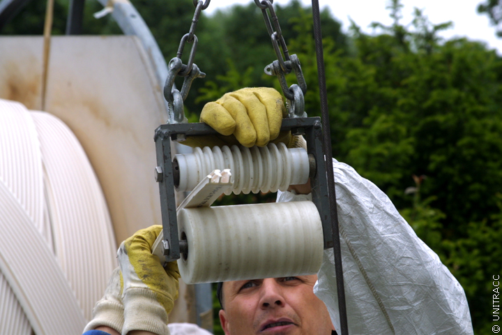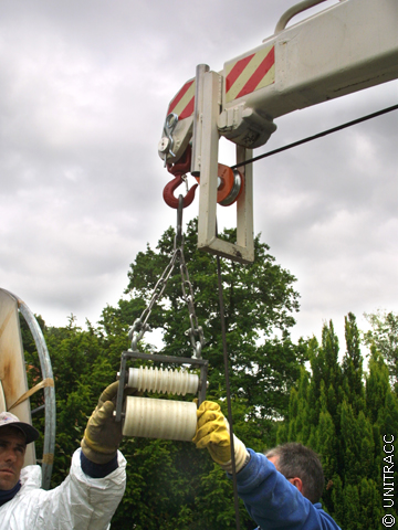 Das angespitzte T-Stegprofil wird durch eine am Ausleger des Radladers befestigte Führungsrolle gezogen und in den Schacht eingeführt.