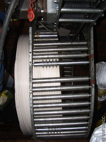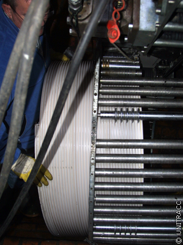 Dort wird es in die Wickelmaschine eingefädelt, an der Innenseite des Wickelkorbs entlang geführt und anschließend über das Nut-Feder-Schnappverschlusssystem mit sich selbst verbunden.