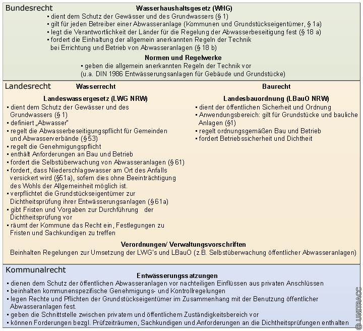 Auf Landesebene ist der Bau und Betrieb von Abwasseranlagen sowohl im Wasserrecht [LWGNRW07], Landeswassergesetz) als auch im Baurecht ([BauONW05], Landesbauordnung) geregelt.