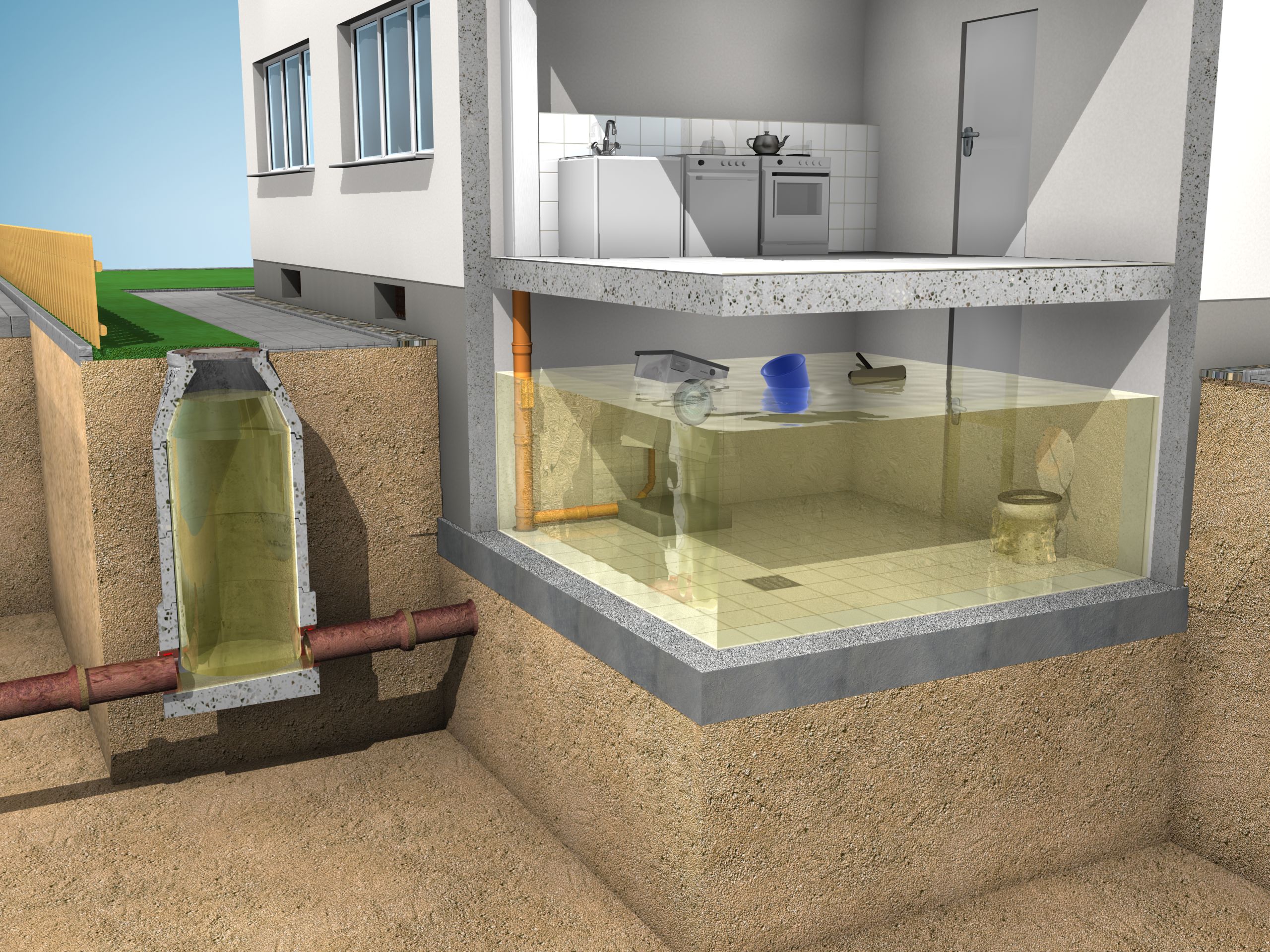 Beim Rückstau staut sich das Abwasser im Kanalnetz und allen angeschlossenen Leitungen und Schächten bis zu der maximalen Höhe auf, bei der es aus den Kanaldeckeln austritt. Das ist dann die sogenannte "Rückstauebene", die in der Regel dem Straßenniveau entspricht. Alle Abläufe (Bodenabläufe, Waschbecken, Toiletten u.s.w.), die unterhalb dieser Ebene liegen, sind rückstaugefährdet und müssen laut Vorgaben in der Entwässerungssatzung durch Rückstausicherungen geschützt werden.