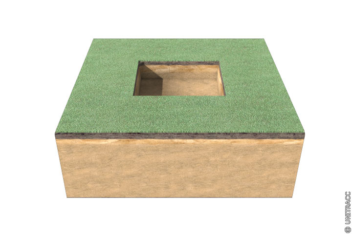 In der gewählten Tiefenlage wird ein Loch (Bild 16.5-1) gegraben mit einer Fläche von ca. 50 cm x 50 cm und einer Tiefe von 20 cm unterhalb der Mutterbodenschicht, die i.d.R. ca. 20 cm bis 30 cm stark ist.