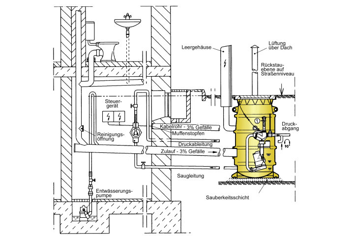 Dem Sammelraum fließt das Schmutzwasser im Freigefälle zu. "Dieser Raum kann ein Sammelbehälter oder ein Sammelschacht sein" [DINEN1671], an dem ein oder mehrere Gebäude angeschlossen werden.