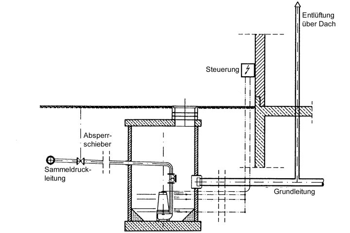 Der Druckerzeuger ist eine "beim Sammelraum installierte Pumpe, die den Druck für den Transport des Schmutzwassers durch das Leitungssystem erzeugt" [DINEN1671].