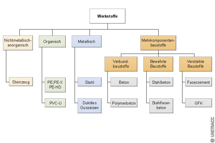 Bei den zur Herstellung von Abwasserleitungen und -kanälen eingesetzten Werkstoffen (Sammelbezeichnung für alle Materialien) wird zwischen metallischen, organischen, nichtmetallisch-anorganischen und Mehrkomponentenbaustoffen unterschieden (Bild 6.2.2.5.2-11).