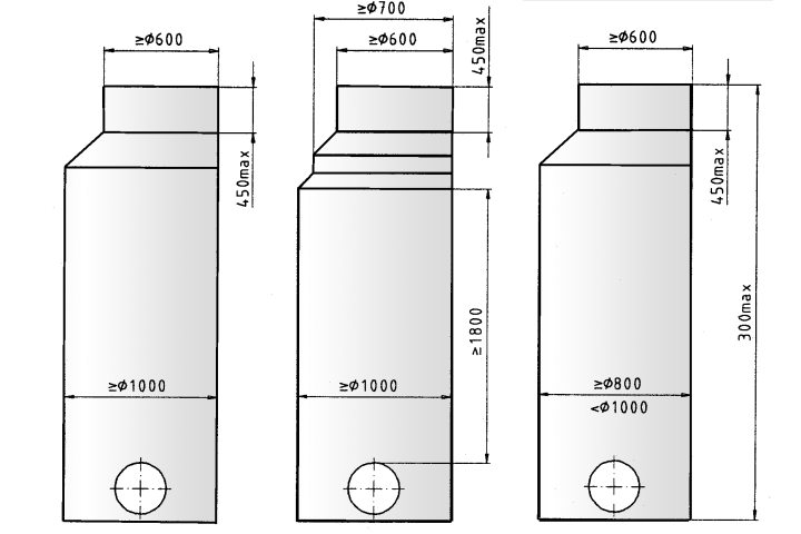 Bei Abwasserleitungen und -kanälen mit Nennweiten ≥ DN 700 können die Schachtunterteile auch seitlich an Beton- und Stahlbetonrohre nach DIN 4032 [DIN4032:1981] oder DIN 4035 [DIN4035] angeformt werden (Bild 6.2.2.5.2-16) (Bild 6.2.2.5.2-17) (Bild 6.2.2.5.2-18).