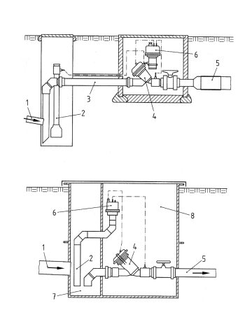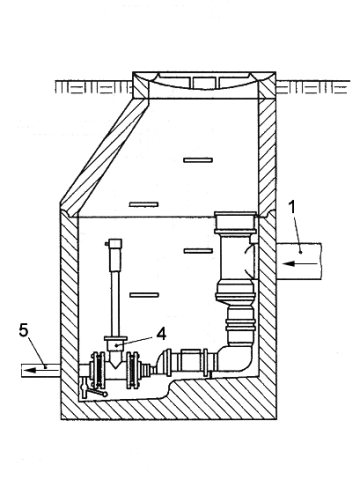 Das häusliche Schmutzwasser wird zunächst über eine als Freispiegelleitung betriebene Grundleitung (hier als Schwerkraftentwässerungsleitung bezeichnet) (Abschnitt 1.1.4.1) vom Gebäude in den Hausanschlussschacht geleitet (Bild 6.2.2.5.4-3).
