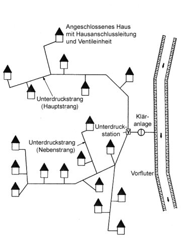 Ein Unterdruckentwässerungssystem nach DIN EN 1091 [DINEN1091] (in der Praxis auch als Vakuumsystem bezeichnet [Grüne93]) ist ein System zum Fördern von häuslichem Schmutzwasser durch eine einzelne Unterdruckleitung oder ein aus Unterdruckleitungen bestehendes Verästelungsnetz (Abschnitt 1.1.1) mit am Beginn der Unterdruckleitungen in Hausanschlussschächten angeordneten Absaugventilen. Die Unterdruckleitungen münden in die Unterdruckstation, von wo aus das Schmutzwasser im allgemeinen mittels Pumpen z.B. zur Kläranlage abgefördert wird (Bild 6.2.2.5.4-1) (Bild 6.2.2.5.4-2).