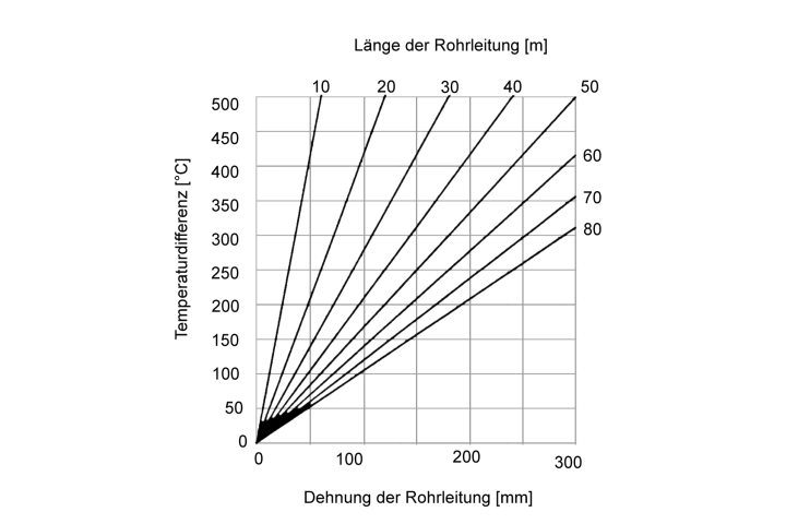 Dehnungsdiagramm für Rohrleitungen aus Stahl in Abhängigkeit von der Temperaturdifferenz [Girna68a] |