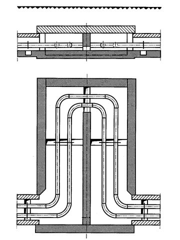 Sofern für diese kein ausreichender Platz zur Verfügung steht, können zur Dehnungsaufnahme bei SMR auch Axialkompensatoren eingesetzt werden (Bild 6.2.2.4-22). In diesem Fall werden die Dehnbewegungen des Stahlmediumrohres innerhalb des Mantelrohres aufgenommen, wobei das Mediumrohr in der Regel auf Axialrollen- oder -gleitlagern montiert ist, die eine Wärmedämmung zum Mediumrohr erhalten (Bild 6.2.2.4-23) (Bild 6.2.2.4-24).