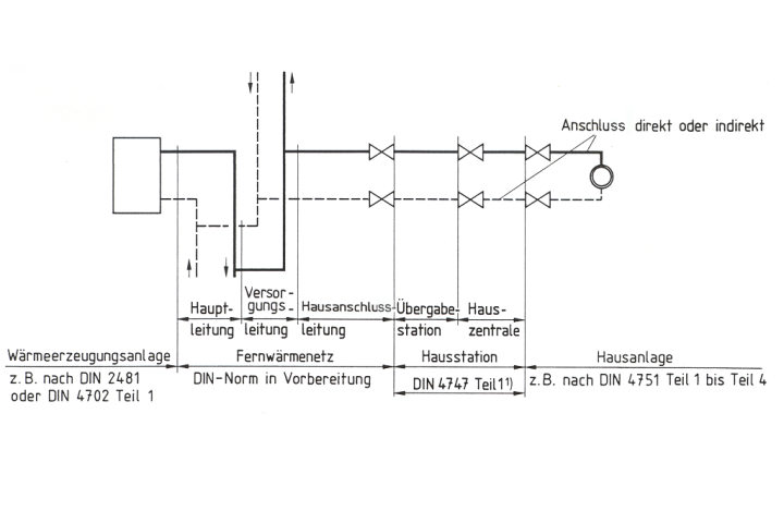 Erläuterung einer Hausstation innerhalb eines Fernwärmeversorgungssystems nach DIN 4747-1 [DIN4747]