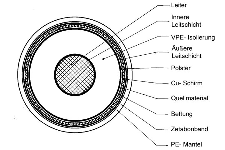 Prinzipieller Aufbau eines VPE-isolierten Hochspannungskabels [FI-AEG] - Querschnitt |