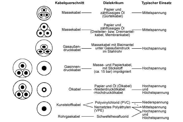 Typische Kabelquerschnitte mit unterschiedlichen Isolierungssystemen (schematisch) [Küchl96] |