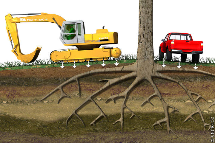 - Verdichtung des Wurzelraumes durch Belastung der Wurzelfläche mit Materialien, Geräten oder Fahrzeugen (Bild 1.12-1) ;
