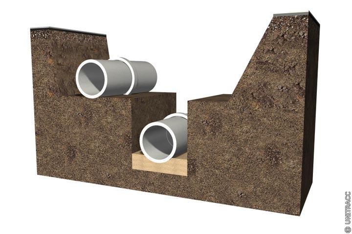 Durch den Grabenaushub ergeben sich unterschiedliche Baugrundzonen und zwar der anstehende ungestörte Baugrund (anstehender Boden nach DIN EN 1610 [DINEN1610:1997] ) sowie der gestörte Baugrund im Bereich des Grabenquerschnittes bzw. in der Dammschüttung. Die Abmessungen des gestörten Baugrundbereiches werden durch die Grabentiefe und -breite bestimmt. Die Gesamtgrabenbreite setzt sich dabei aus der Mindestgrabenbreite zuzüglich der Dicke des Verbaus zusammen, die beispielsweise beim senkrechten Normverbau mit Tafelprofilen und waagerechten Gurtungen 0,4 m betragen kann. Im Querschnitt selbst unterscheidet man zwischen der Leitungszone und der Hauptverfüllung.