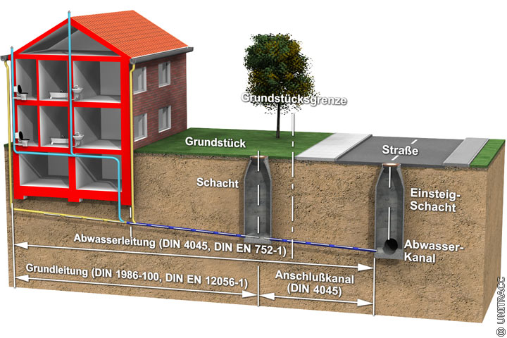 Im Deutschen Normenwerk gehört zum öffentlichen Zuständigkeitsbereich der Kanalisation auch der Anschlusskanal nach DIN 4045 [DIN4045:1985] : Kanal zwischen dem öffentlichen Abwasserkanal und der Grundstücksgrenze bzw. der ersten Reinigungsöffnung (z.B. Übergabeschacht) auf dem Grundstück (Bild 1.2-3) (Bild 1.2-4) .
