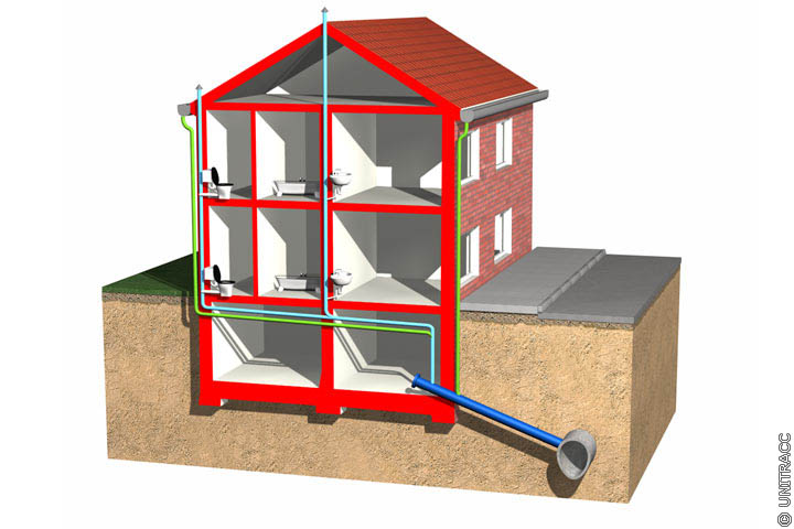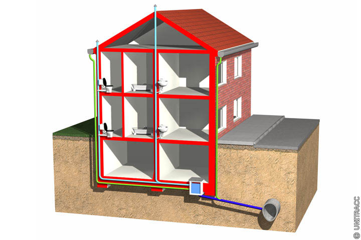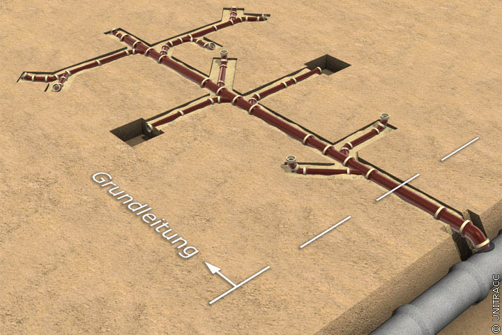 Grundleitungen sind "im Erdreich oder in der Grundplatte unzugänglich verlegte Leitungen, die das Abwasser in der Regel dem Anschlußkanal zuführen" [DIN1986:1995] (Bild 1.9.1-1) (Bild 1.9.1-3) (Bild 1.9.1-2).