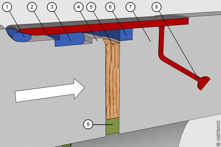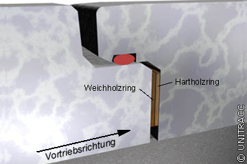 Während in Deutschland bei Vortriebsrohren mit Falzmuffe (Falzverbindung) die Übertragung der Vortriebskraft nur über eine Teilstirnfläche des Rohres (innen oder außen) erfolgt (Bild 1.7.7.2.1-19) , geschieht dies in Großbritannien i.d.R. über beide Stirnflächen (Bild 1.7.7.2.1-20) (Bild 1.7.7.2.1-21) .