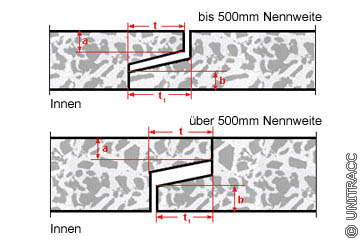 Erste Maßfestlegungen für die Falzverbindung enthielt die DIN 4032, Juli 1939 [DIN4032:1981/59] . Sie forderte eine Mindestfalztiefe von 25 mm und bei Rohren bis DN 500 bzw. 400/600 mußte der Falz länger als die Nut sein; bei größerer Nennweite kürzer (Bild 1.7.7.2.1-3) .