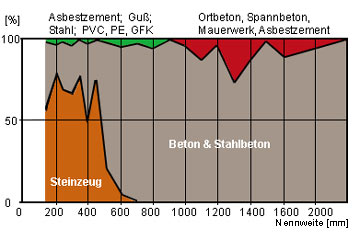 Anteile der Werkstoffe (Kreisquerschnitt) am Kanalnetz Stuttgart gesamt, bezogen auf die Länge [Zäsch86] |