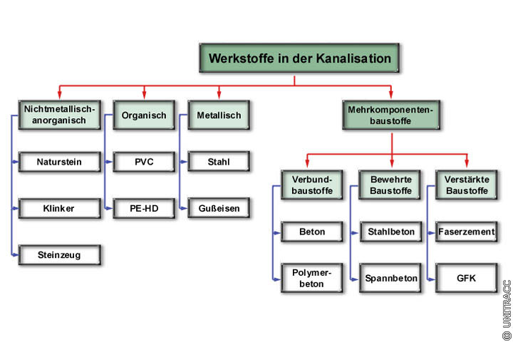Bei den in Kanalisationen eingesetzten Baustoffarten wird zwischen metallischen, organischen, nichtmetallisch-anorganischen und Mehrkomponentenbaustoffen unterschieden. Letztere werden wiederum in Verbundbaustoffe, bewehrte Baustoffe und verstärkte Baustoffe unterteilt [Schor] .