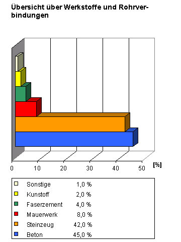 Die im Rahmen einer ATV-Umfrage im Jahre 1990 ermittelte Werkstoffverteilung der Abwasserkanäle in der Bundesrepublik Deutschland ist im (Bild 1.7.1-2) dargestellt. Hierbei ist zu beachten, daß die angegebenen Zahlen durch statistische Durchschnittsbildung entstanden sind.