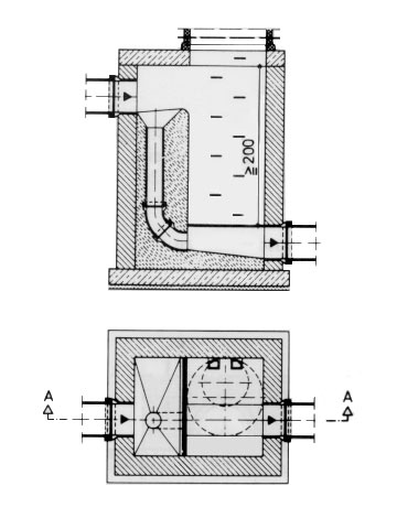 Eine Sonderform der Schächte stellen die Absturzbauwerke zur Ausgleichung größerer Differenzen zwischen Straßengefälle und maximalem Leitungsgefälle dar. Beispiele der wichtigsten Varianten zeigen (Bild 1.8-14) , (Bild 1.8-15) .