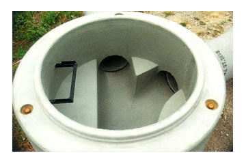 Schnitt durch einen Komplettschacht aus Steinzeug mit offener Rohrdurchführung [FI-Stein] |