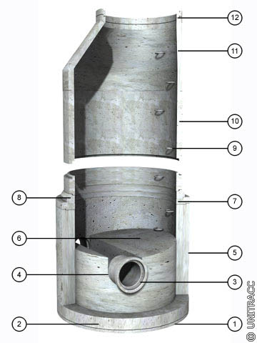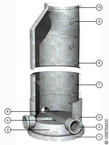 In den (Bild 1.8-2) und (Bild 1.8-3) sind beispielhaft verschiedene Fertigteilschächte mit den Bezeichnungen der Einzelelemente dargestellt.
