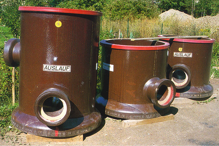 Neben den Schächten aus Beton- und Stahlbetonfertigteilen werden seit einigen Jahren auch Schächte aus anderen Werkstoffen z.B. aus Steinzeug (Bild 1.8-9) (Bild 1.8-10) (Bild 1.8-11) , Faserzement oder Kunststoffen (Bild 1.8-12) oder Kombinationen verschiedener Werkstoffe (Bild 1.8-13) eingesetzt. Darüber hinaus werden Schächte nach wie vor auch örtlich aus Mauerwerk hergestellt.