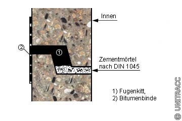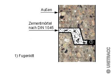 Diese Dichtung kann verwendet werden, wenn kein Grundwasser ansteht und keine besonderen Anforderungen an die Dichtheit gestellt werden (dies gilt nicht für Spezialmörtel mit besonderen Eigenschaften). Der verwendete Zementmörtel soll DIN 1045 [DIN1045:1988] , Abschnitt 6.7.1 entsprechen. Vor Aufbringen des Zementmörtels sind die Dichtflächen anzunässen.