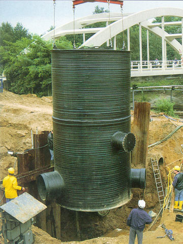 Neben den Schächten aus Beton- und Stahlbetonfertigteilen werden seit einigen Jahren auch Schächte aus anderen Werkstoffen z.B. aus Steinzeug (Bild 1.8-9) (Bild 1.8-10) (Bild 1.8-11) , Faserzement oder Kunststoffen (Bild 1.8-12) oder Kombinationen verschiedener Werkstoffe (Bild 1.8-13) eingesetzt. Darüber hinaus werden Schächte nach wie vor auch örtlich aus Mauerwerk hergestellt.