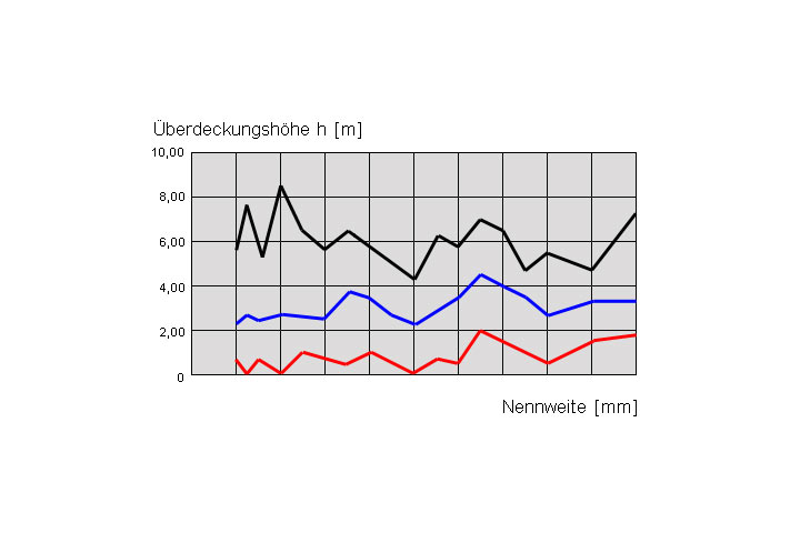 Kleinst-, Mittel- und Größtwerte der Überdeckungshöhen der von 1974 bis 1983 in der Stadt Düsseldorf verlegten Kanäle [Zäsch86]